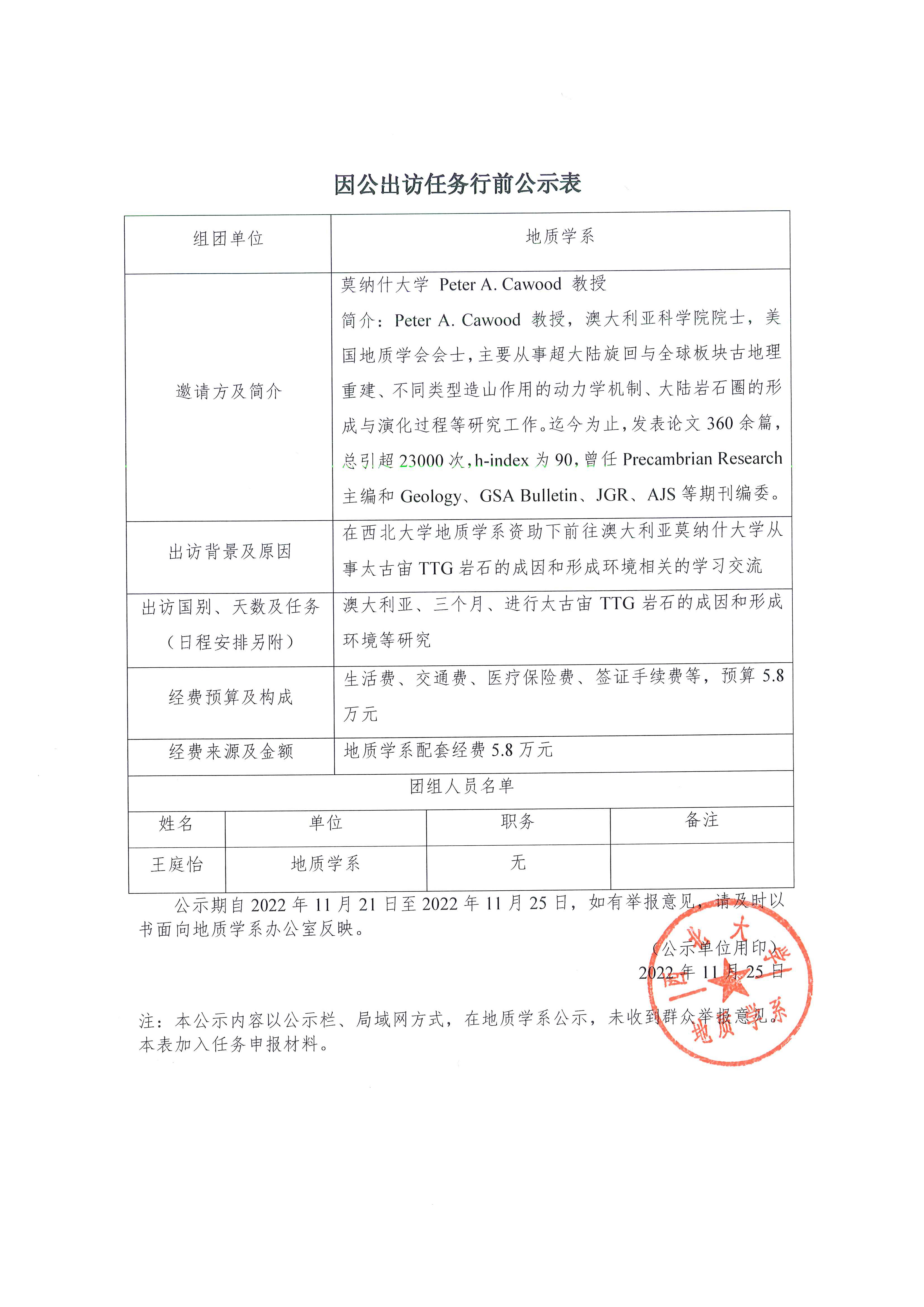 地质学系关于王庭怡因公出访任务行前公示