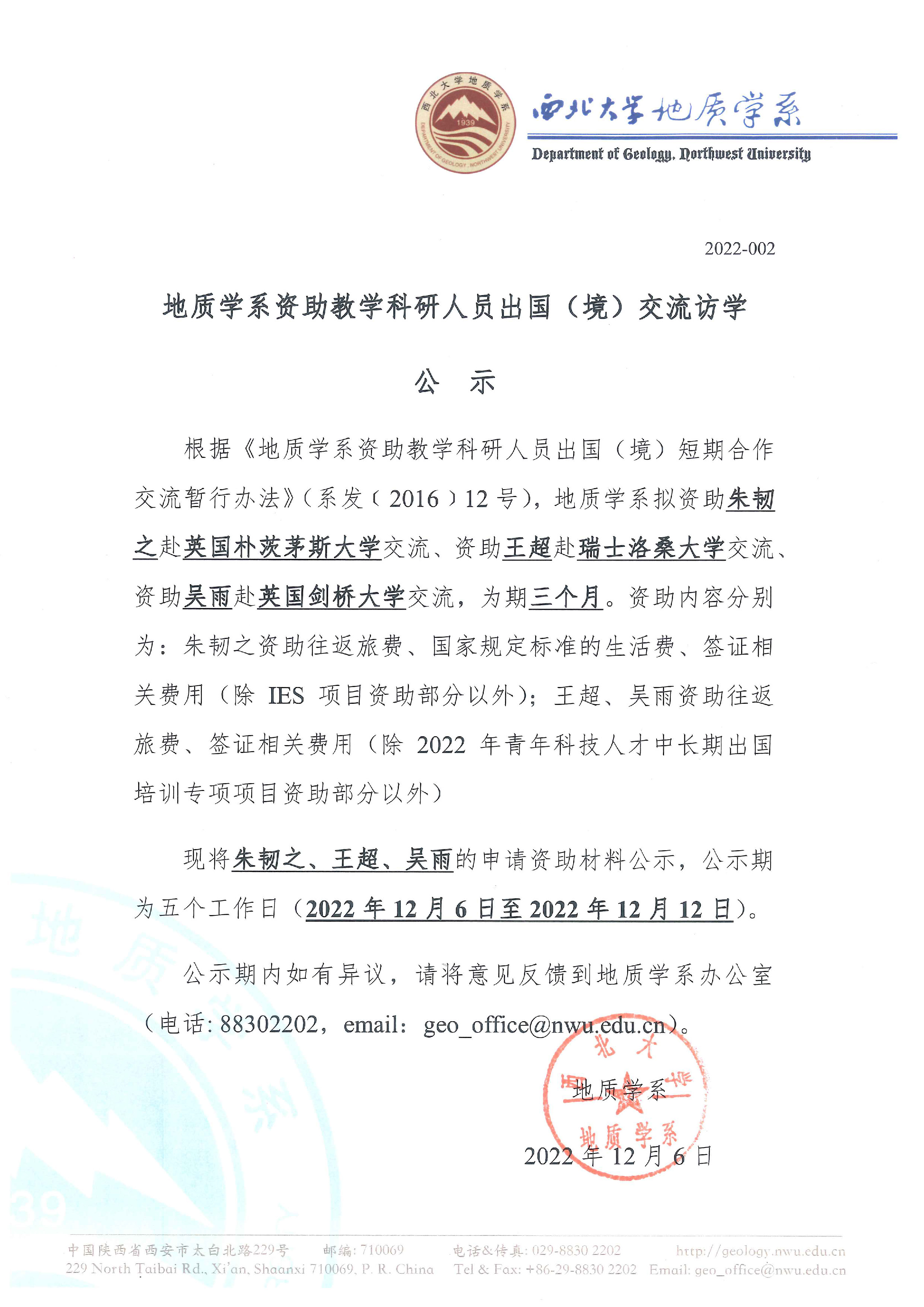 地质学系关于资助朱韧之、王超、吴雨出国(境)交流访学的公示