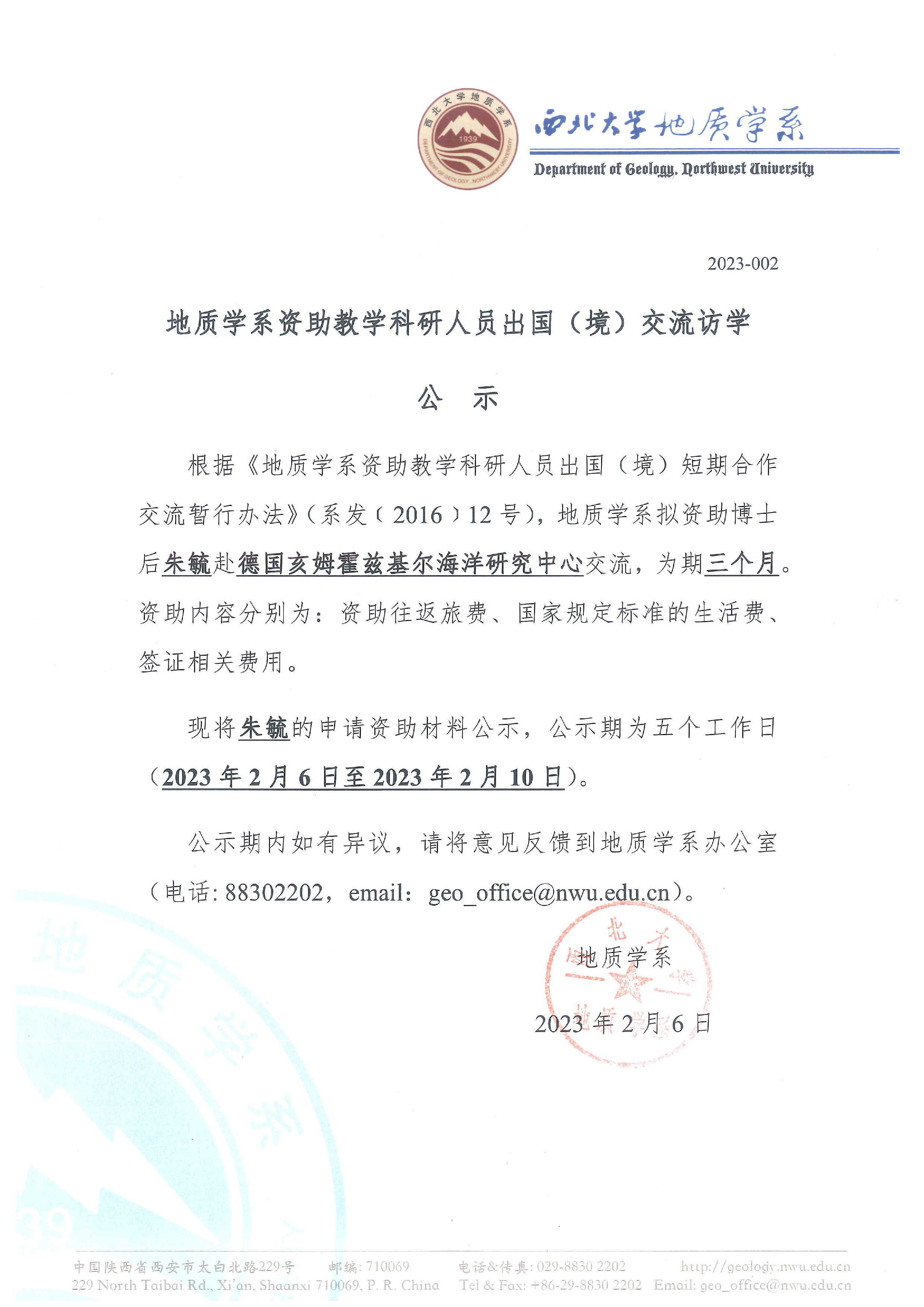 地质学系关于资助博士后朱毓出国短期合作交流的公示