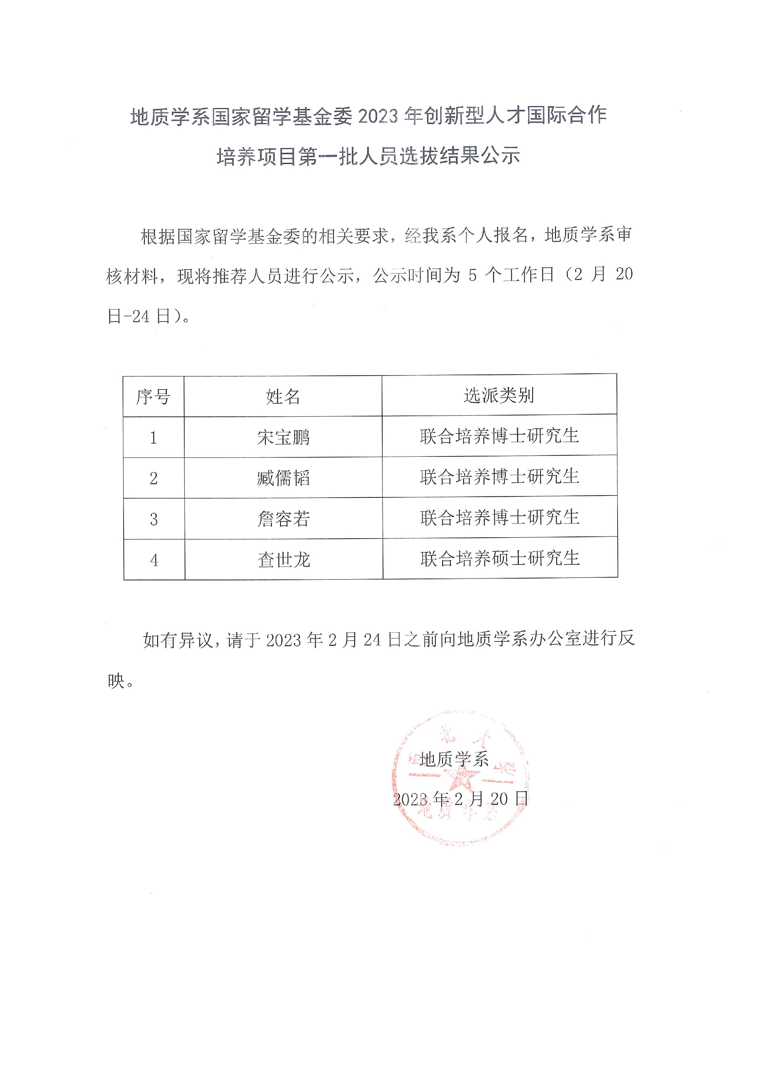 地质学系国家留学基金委2023年创新型人才国际合作 培养项目第一批人员选拔结果公示
