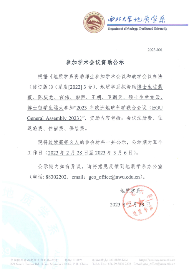 地质学系关于资助博士生边紫薇等8人参加学术会议的公示