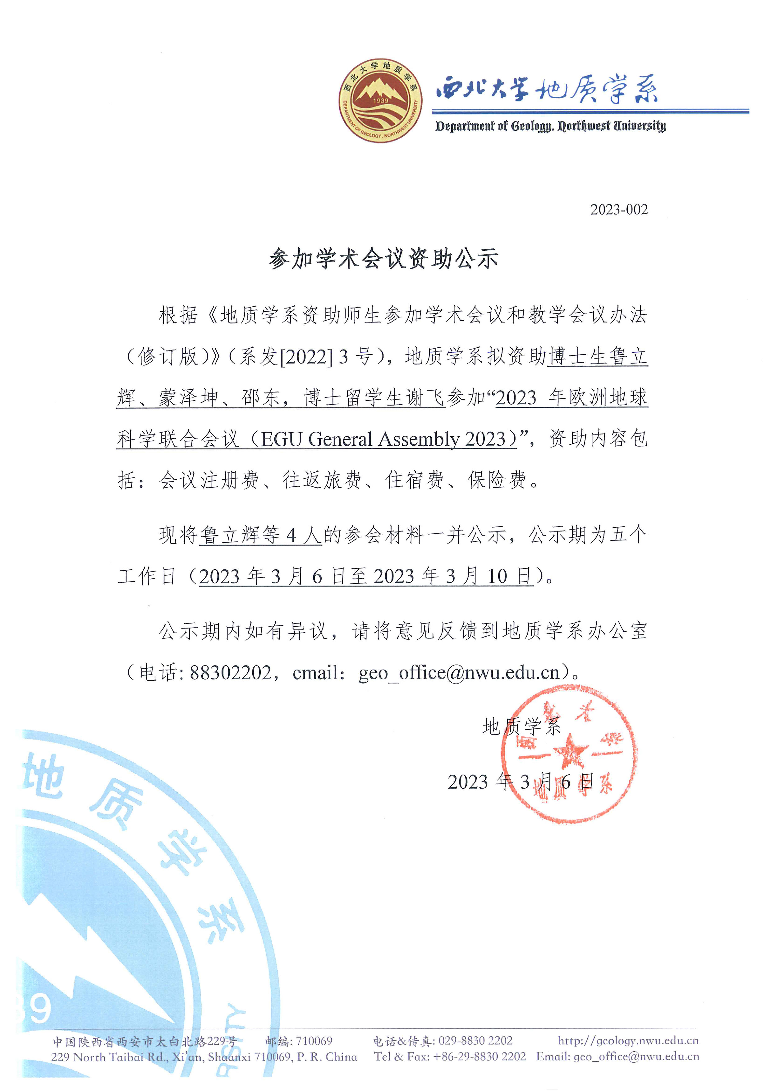 地质学系关于资助博士生鲁立辉等4人参加学术会议的公示