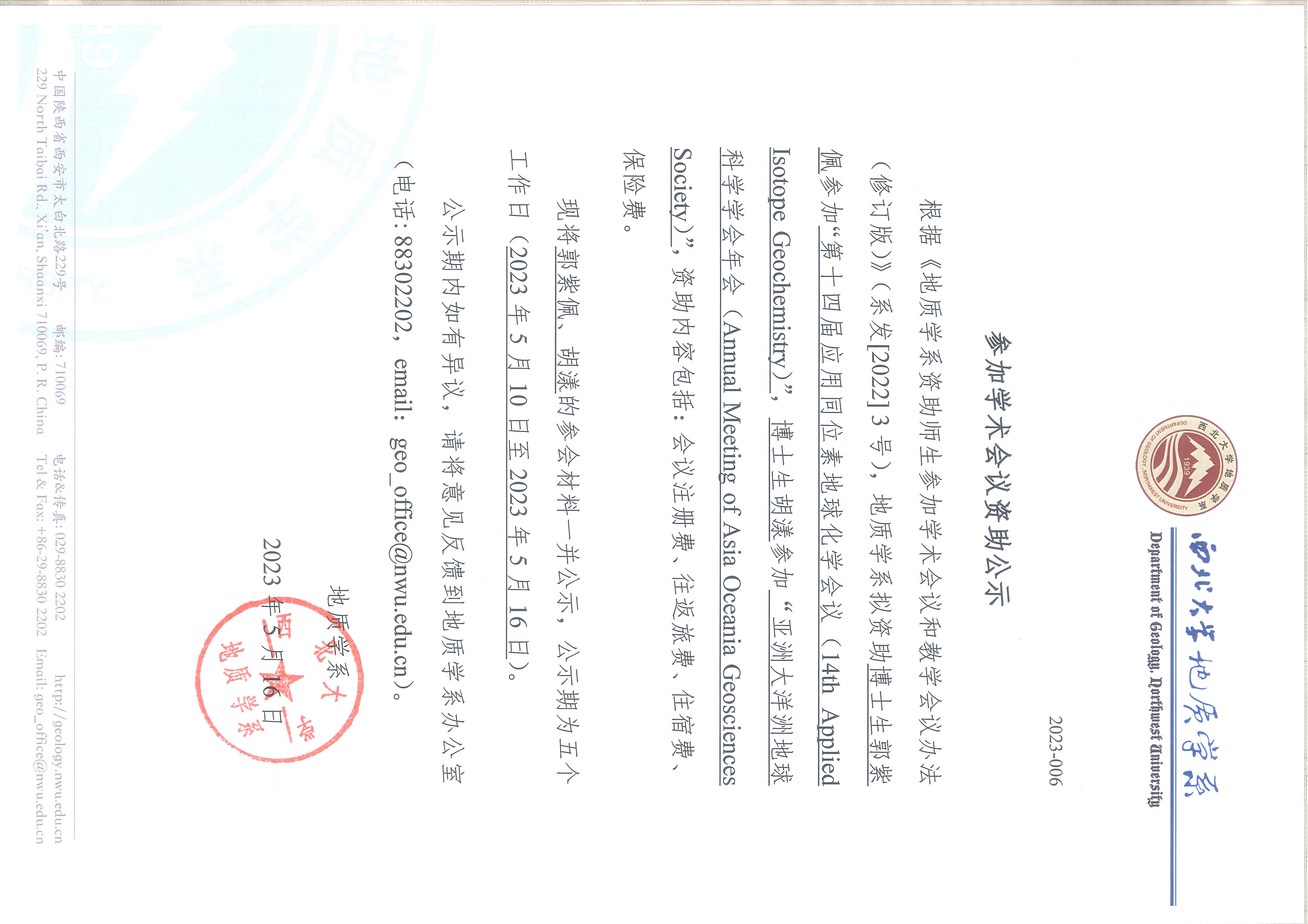 地质学系关于资助博士生郭紫佩、胡漾参加国际会议的公示