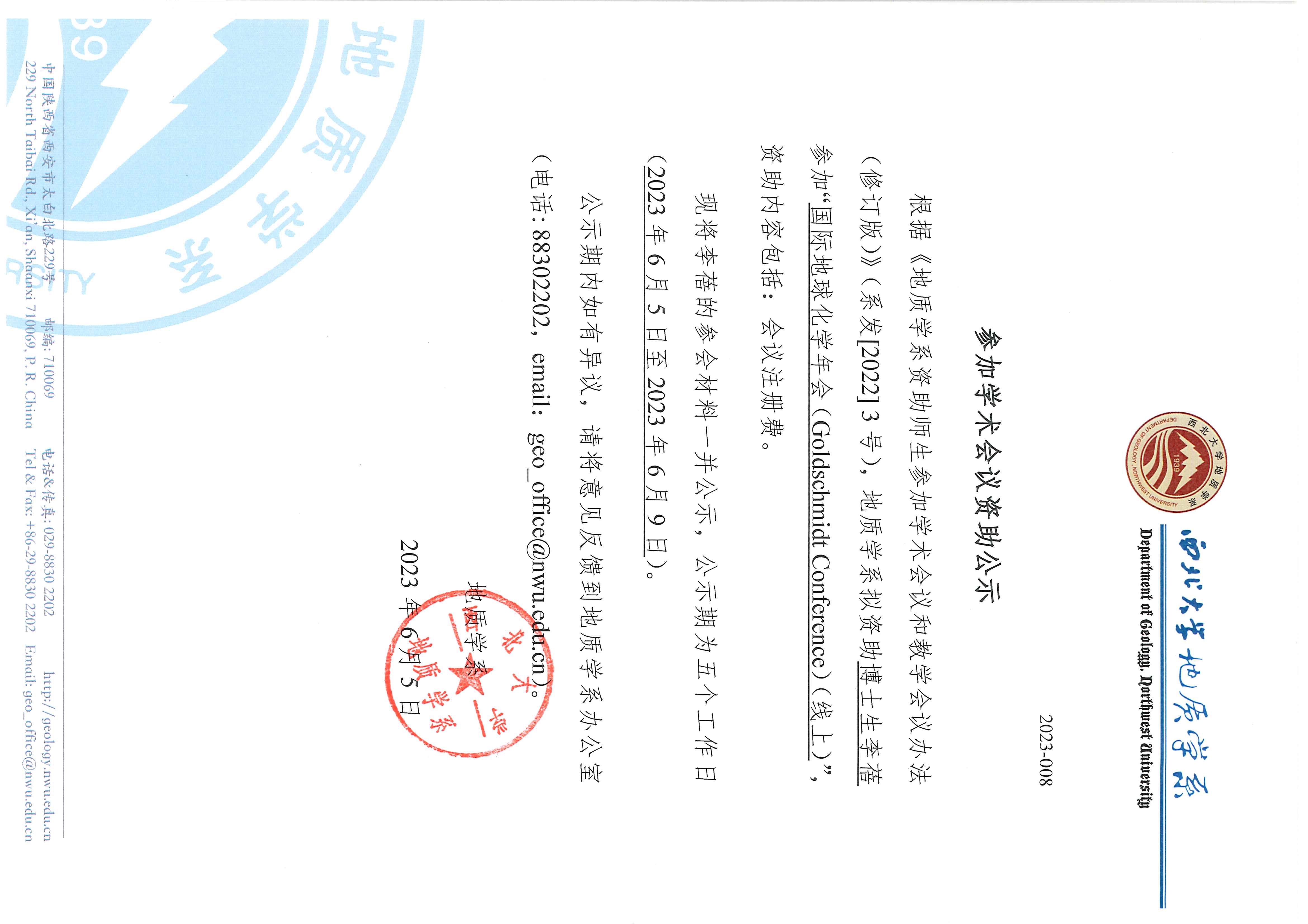 地质学系关于资助博士生李蓓参加国际会议的公示