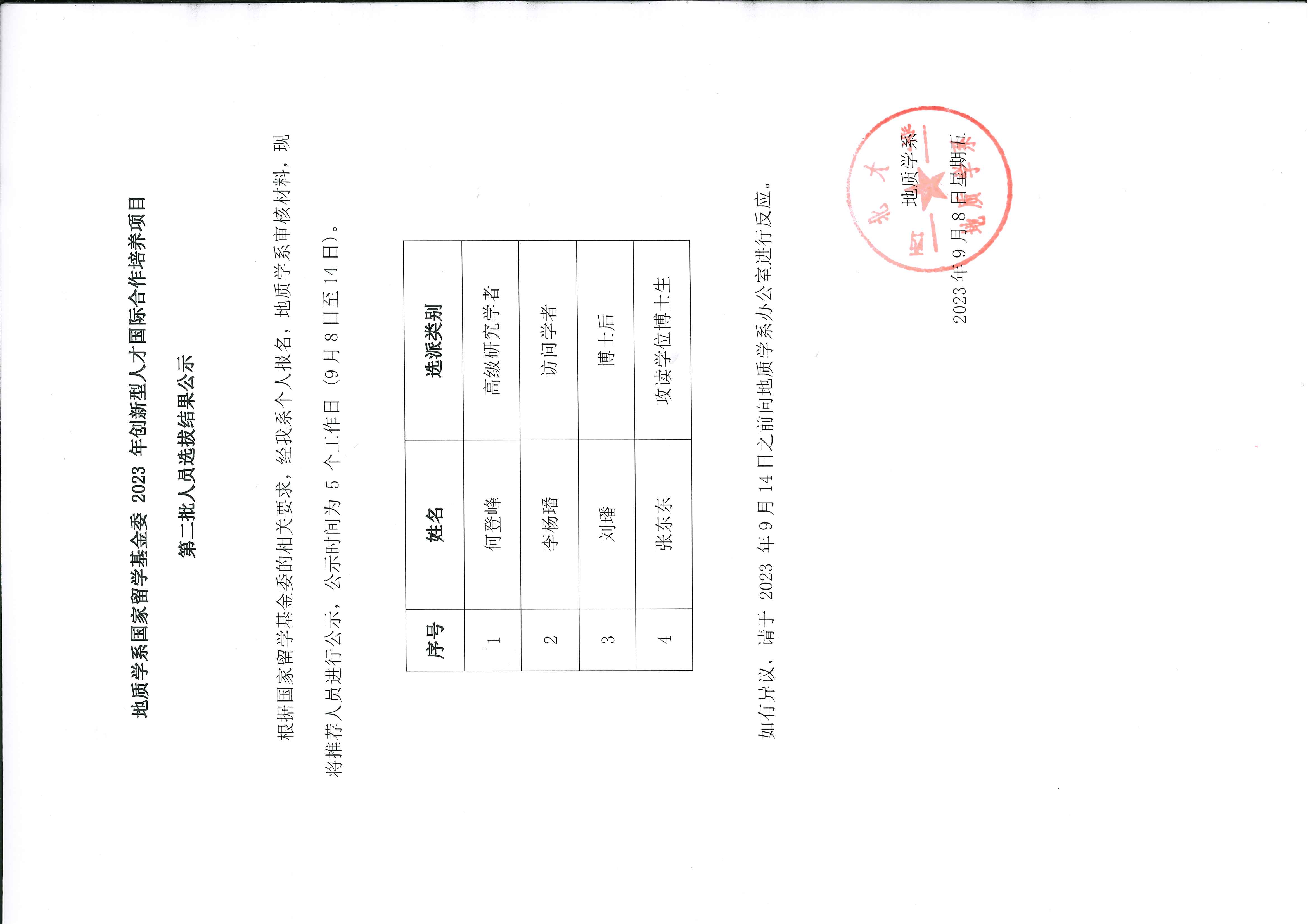 地质学系国家留学基金委 2023 年创新型人才国际合作培养项目第二批人员公示