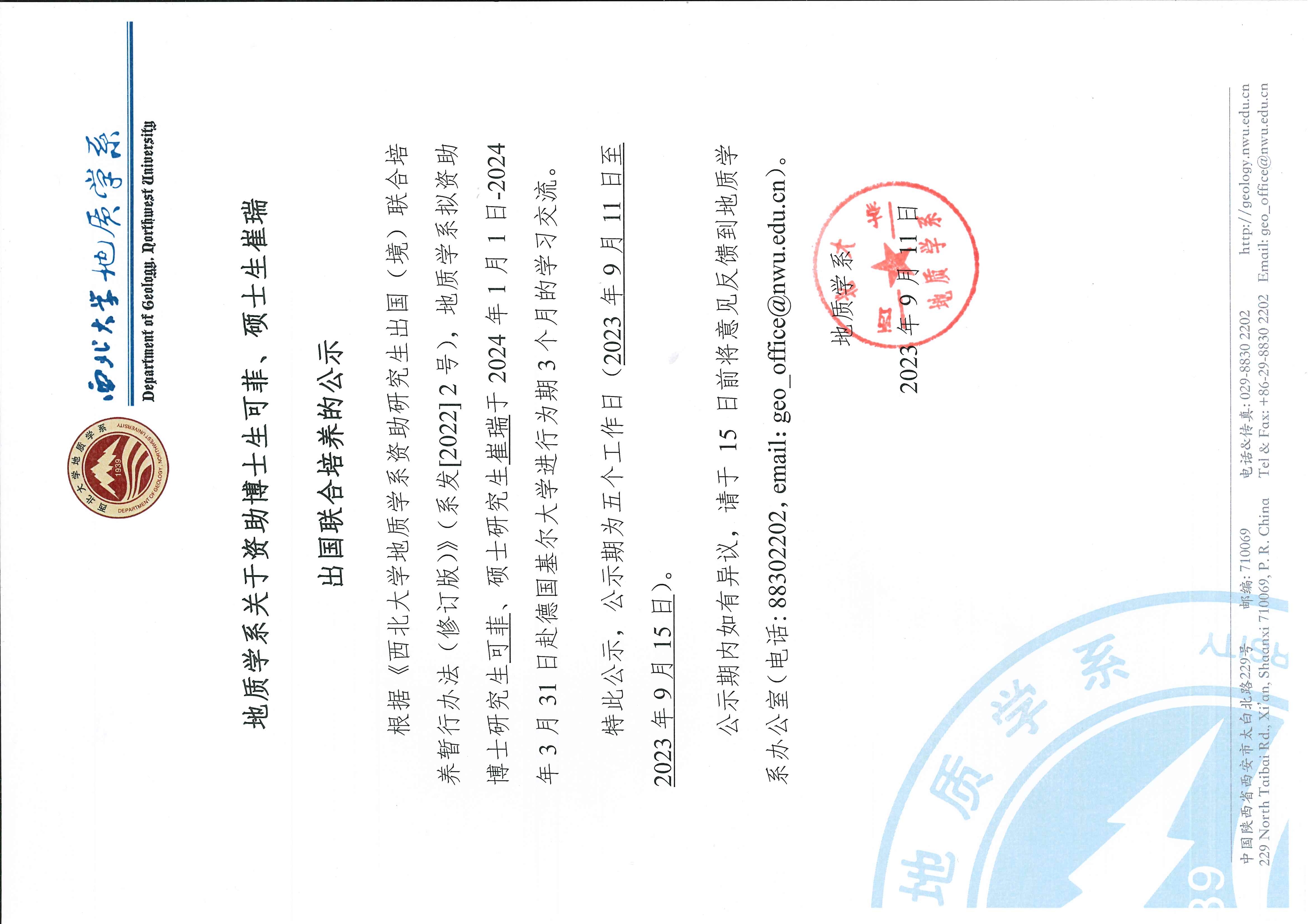 地质学系关于资助博士生可菲、硕士生崔瑞出国联合培养的公示