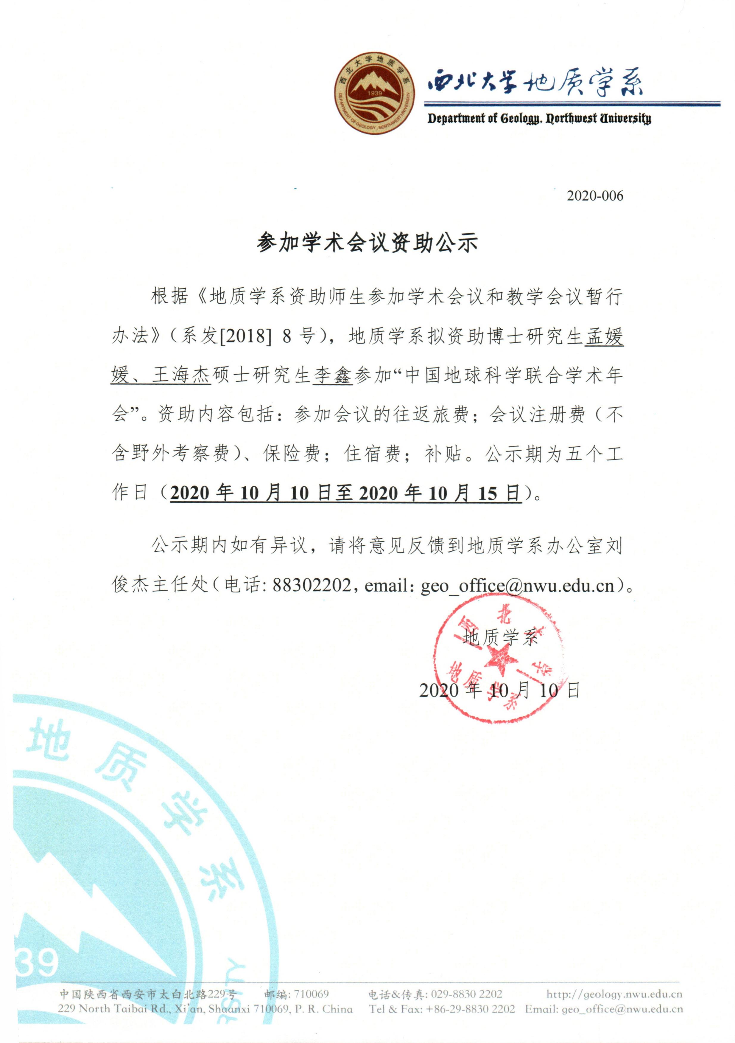地质学系关于资助博士研究生孟媛媛等三人参加学术会议的公示
