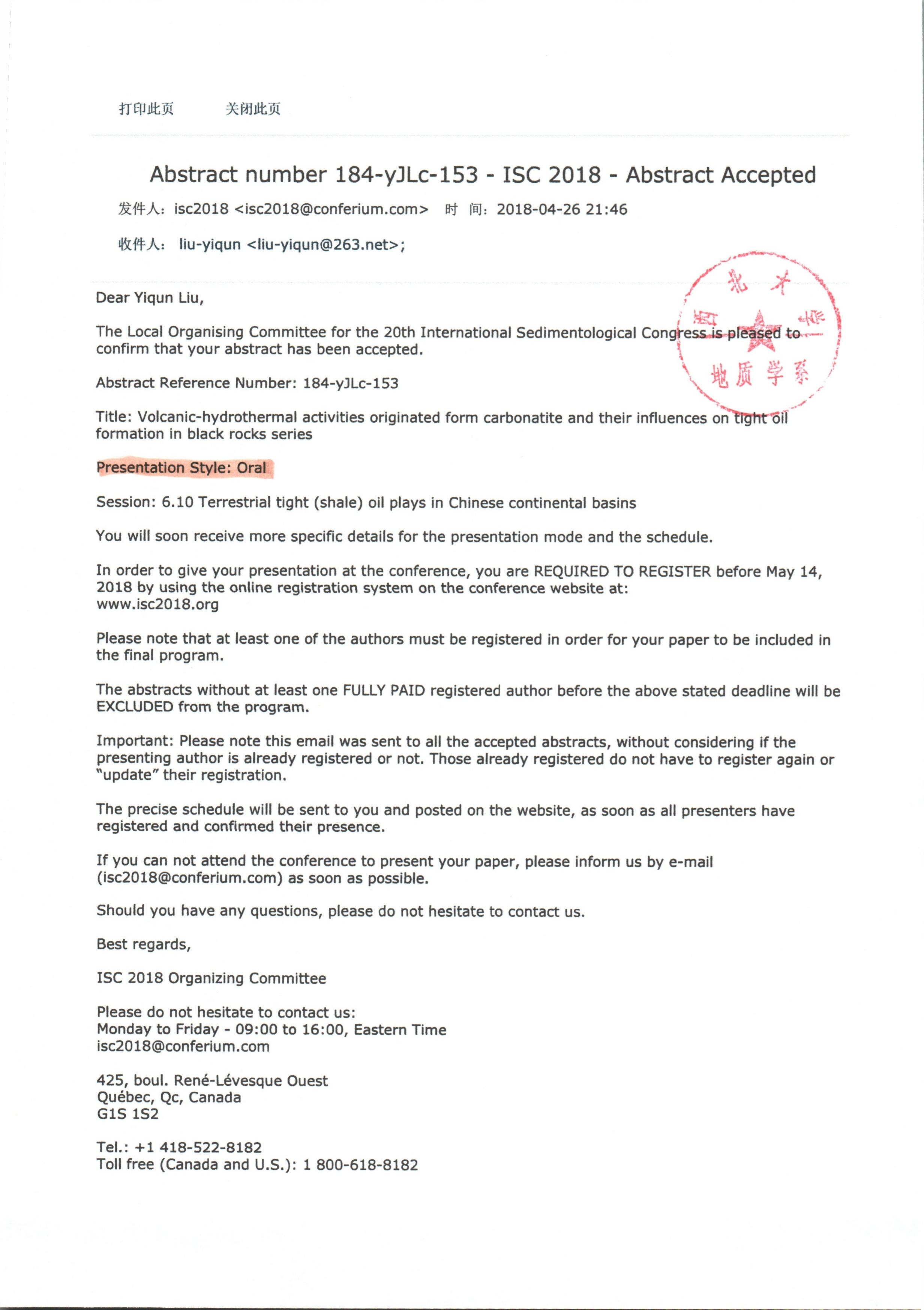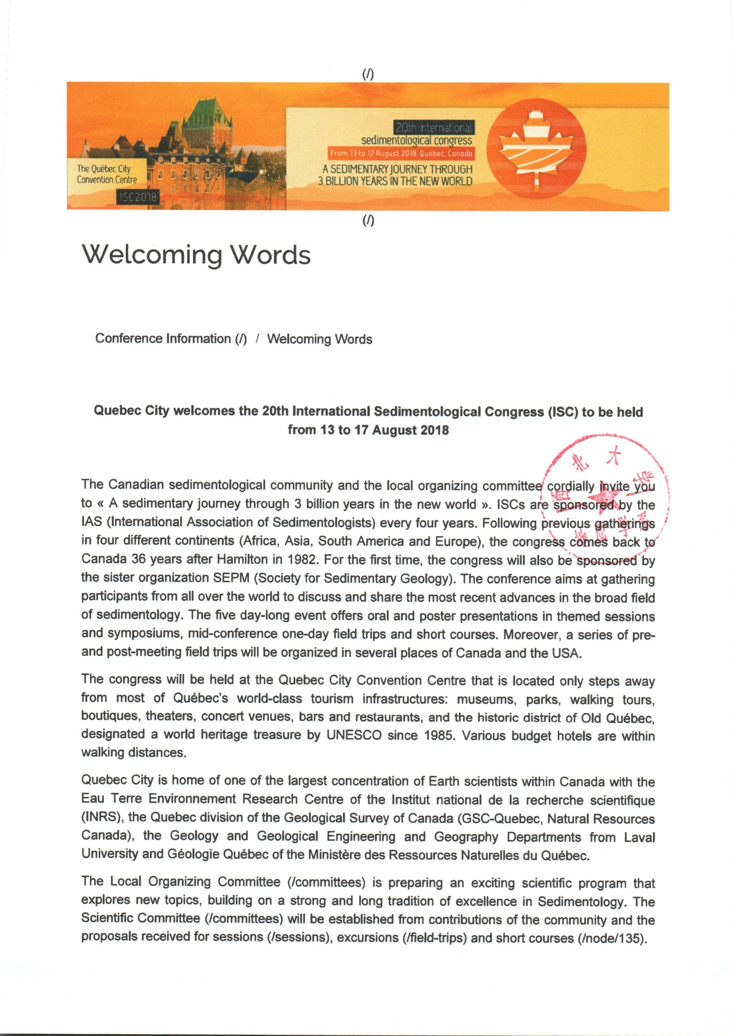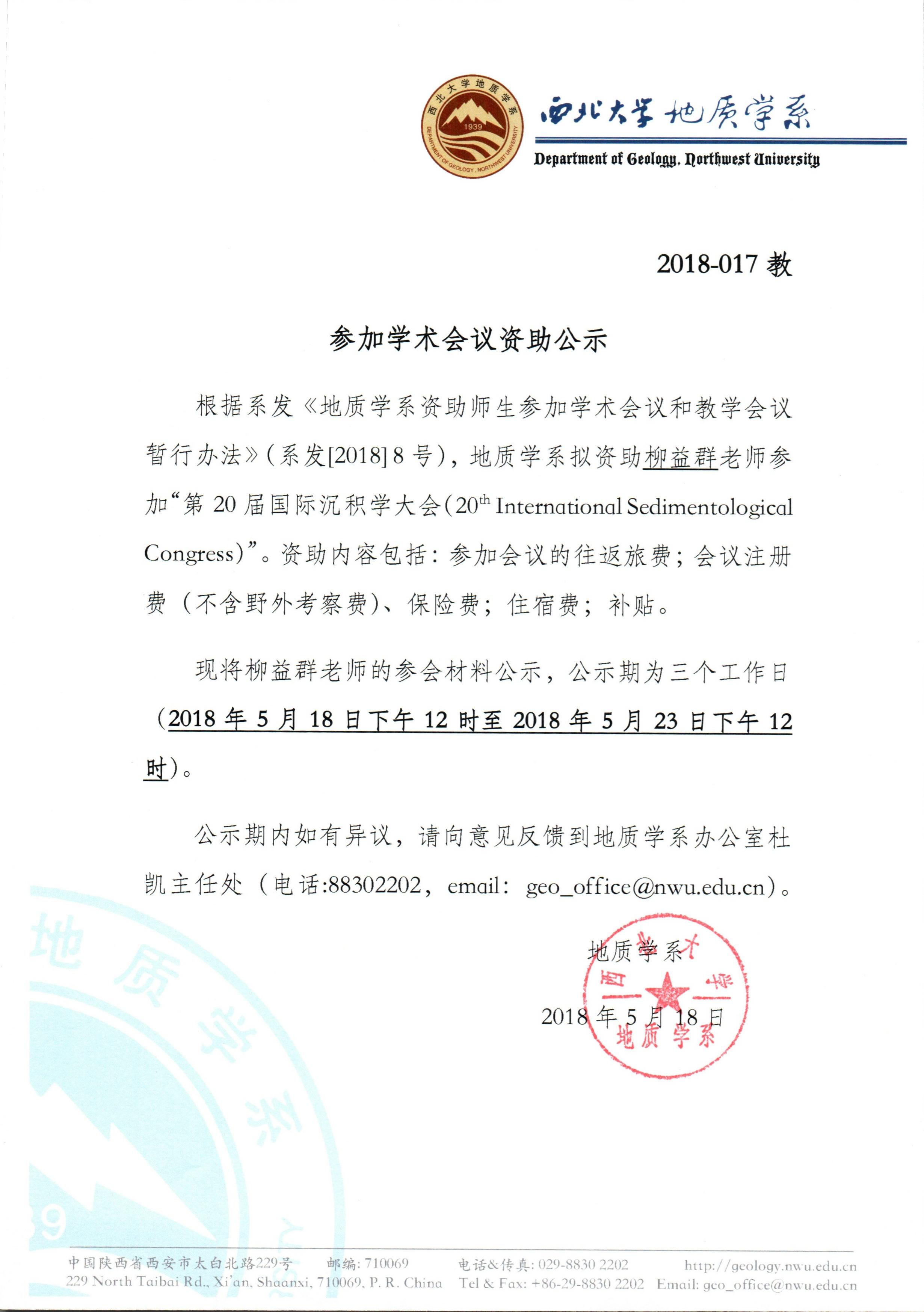 地质学系关于资助柳益群老师参加学术会议的公示