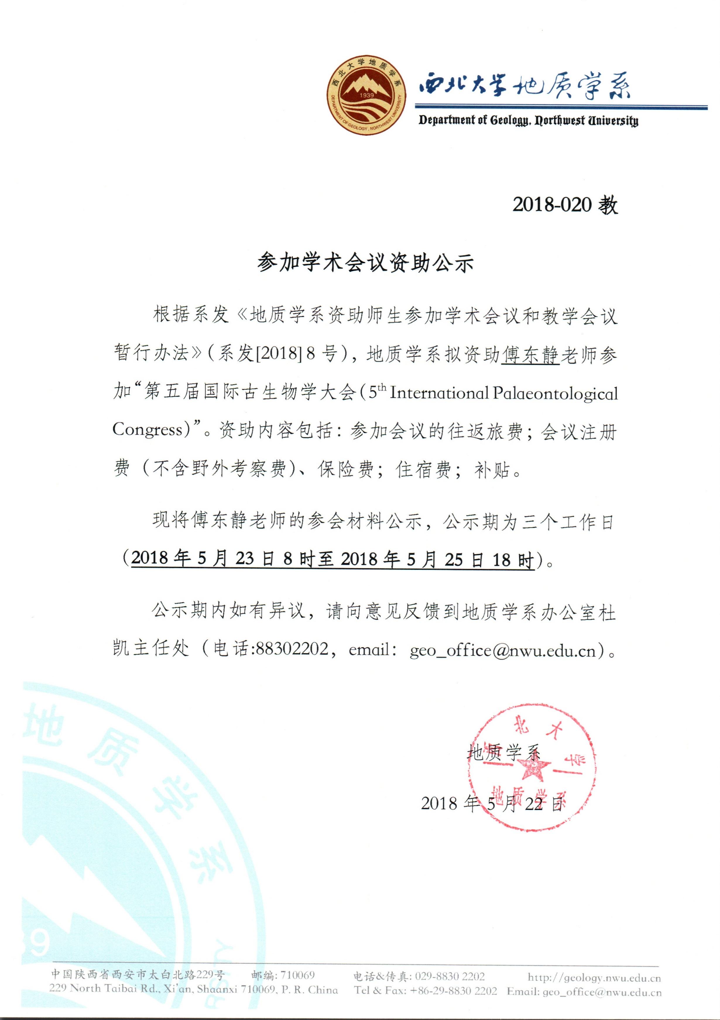 地质学系关于资助傅东静老师参加学术会议的公示