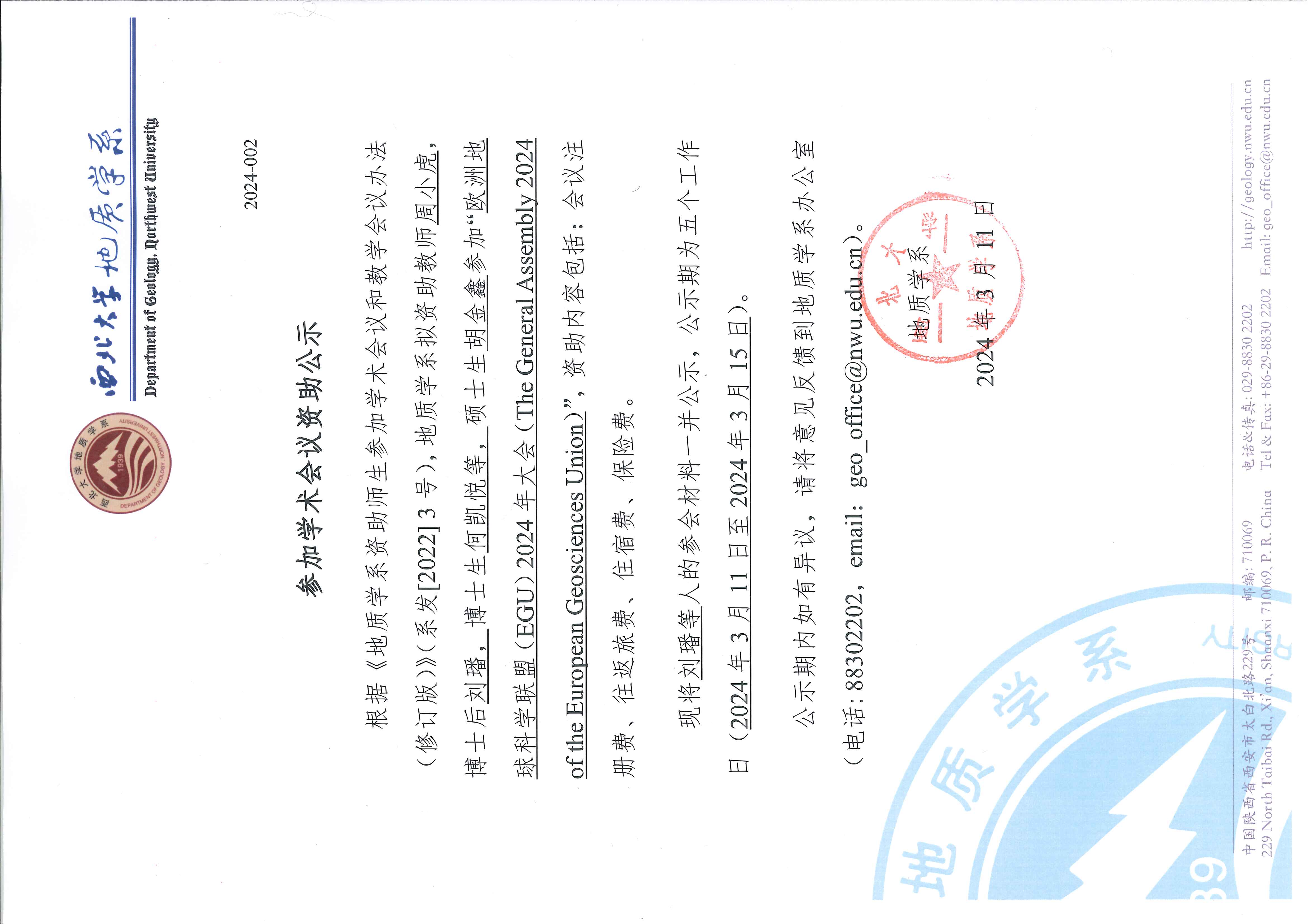 地质学系关于资助教师周小虎、博士后刘璠等人参加国际会议的公示