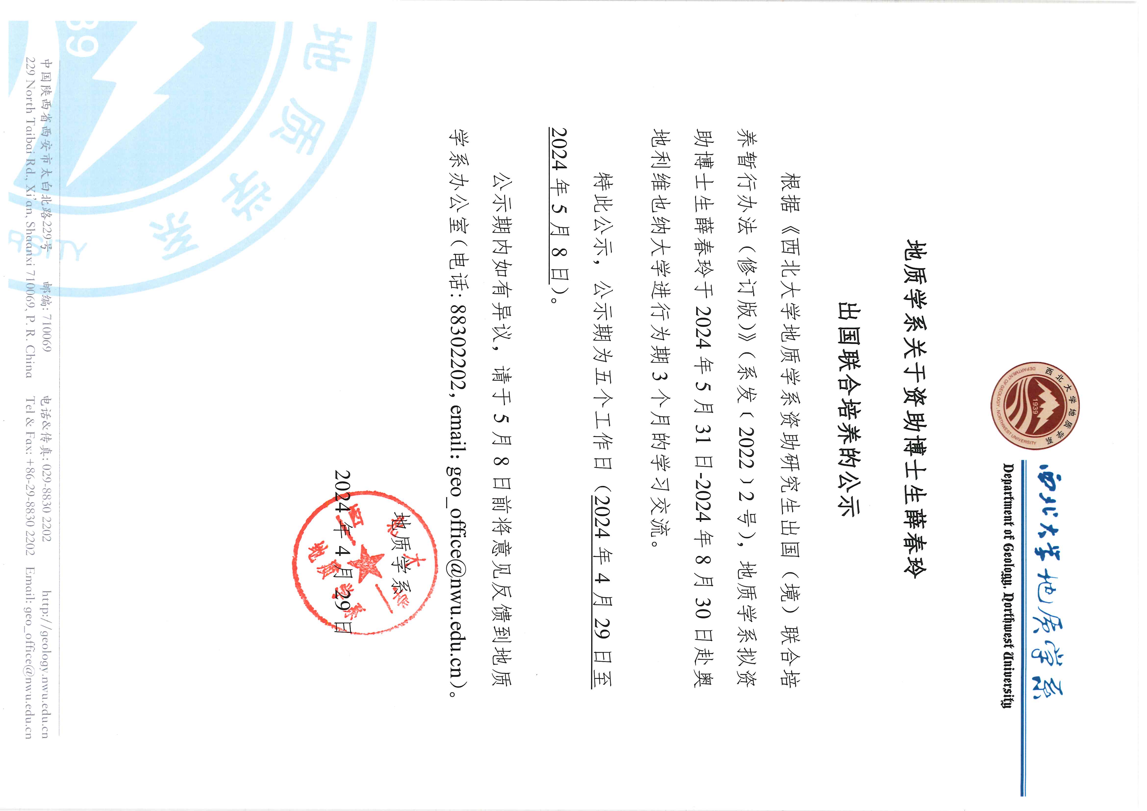 地质学系关于资助博士生 薛春玲出国事宜的公示