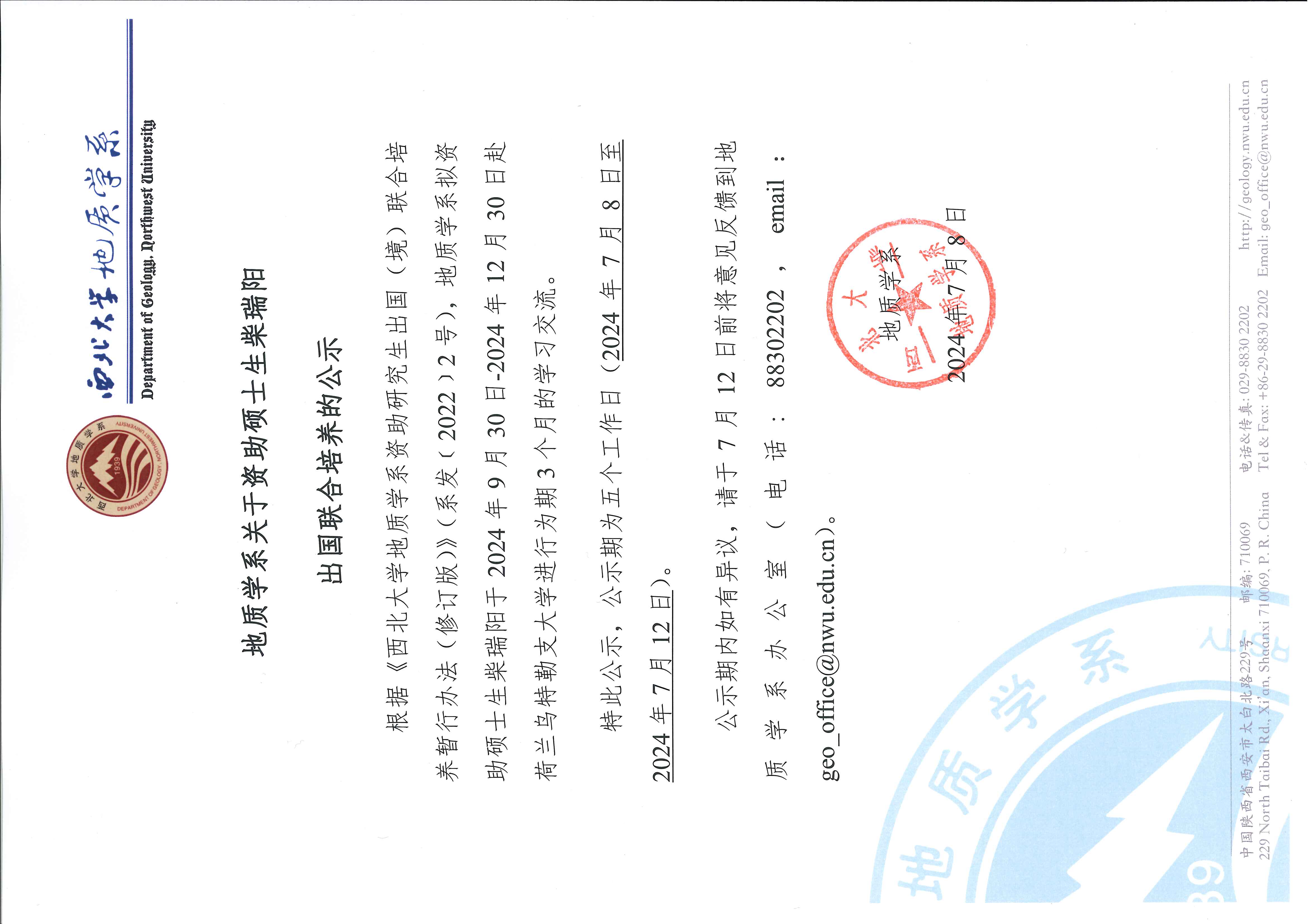 地质学系关于资助硕士生柴瑞阳出国事宜的公示