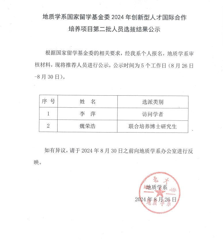 地质学系国家留学基金委2024年创新型人才国际合作培养项目第二批人员选拔结果公示