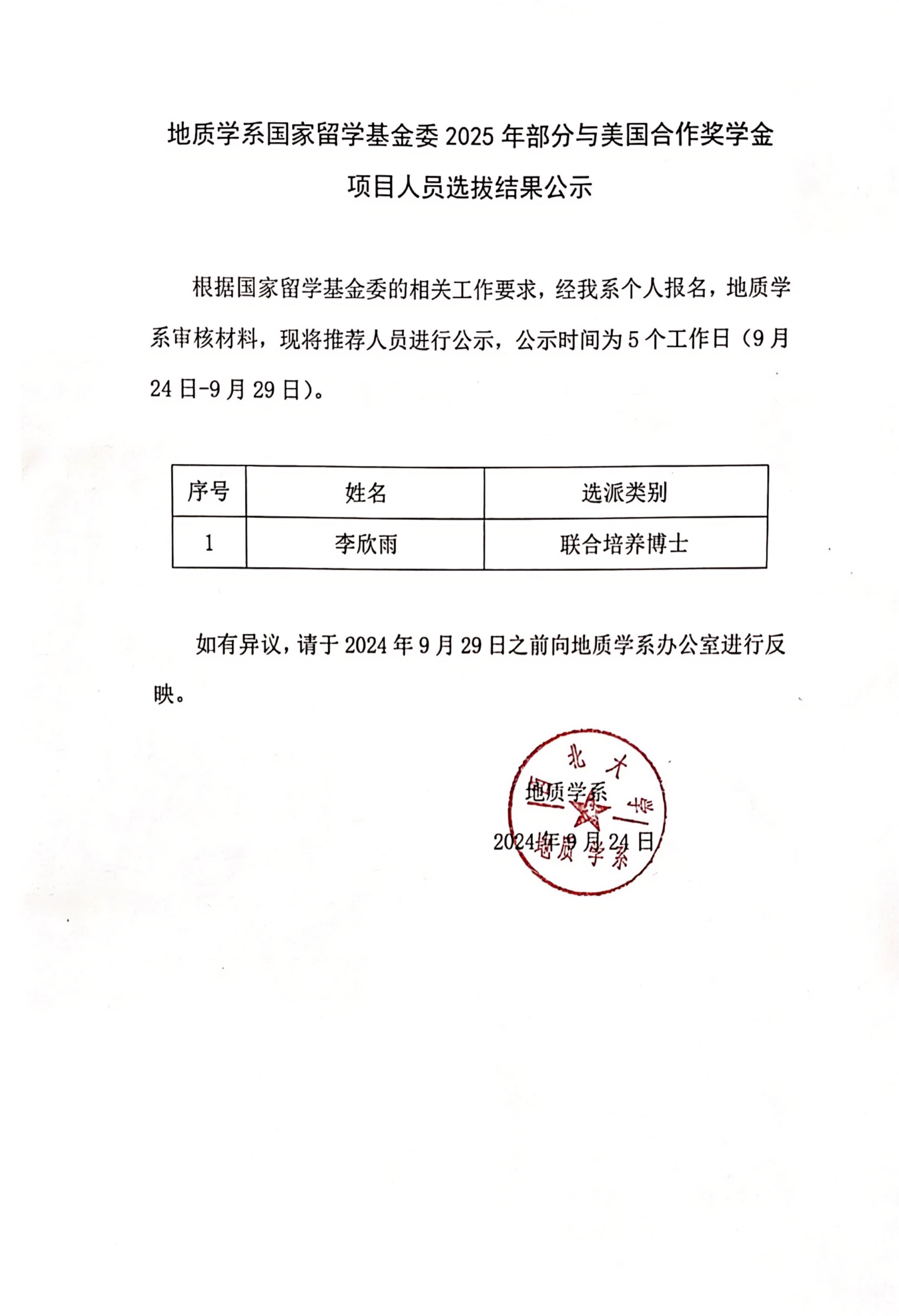 地质学系国家留学基金委2025年部分与美国合作奖学金项目人员选拔结果公示