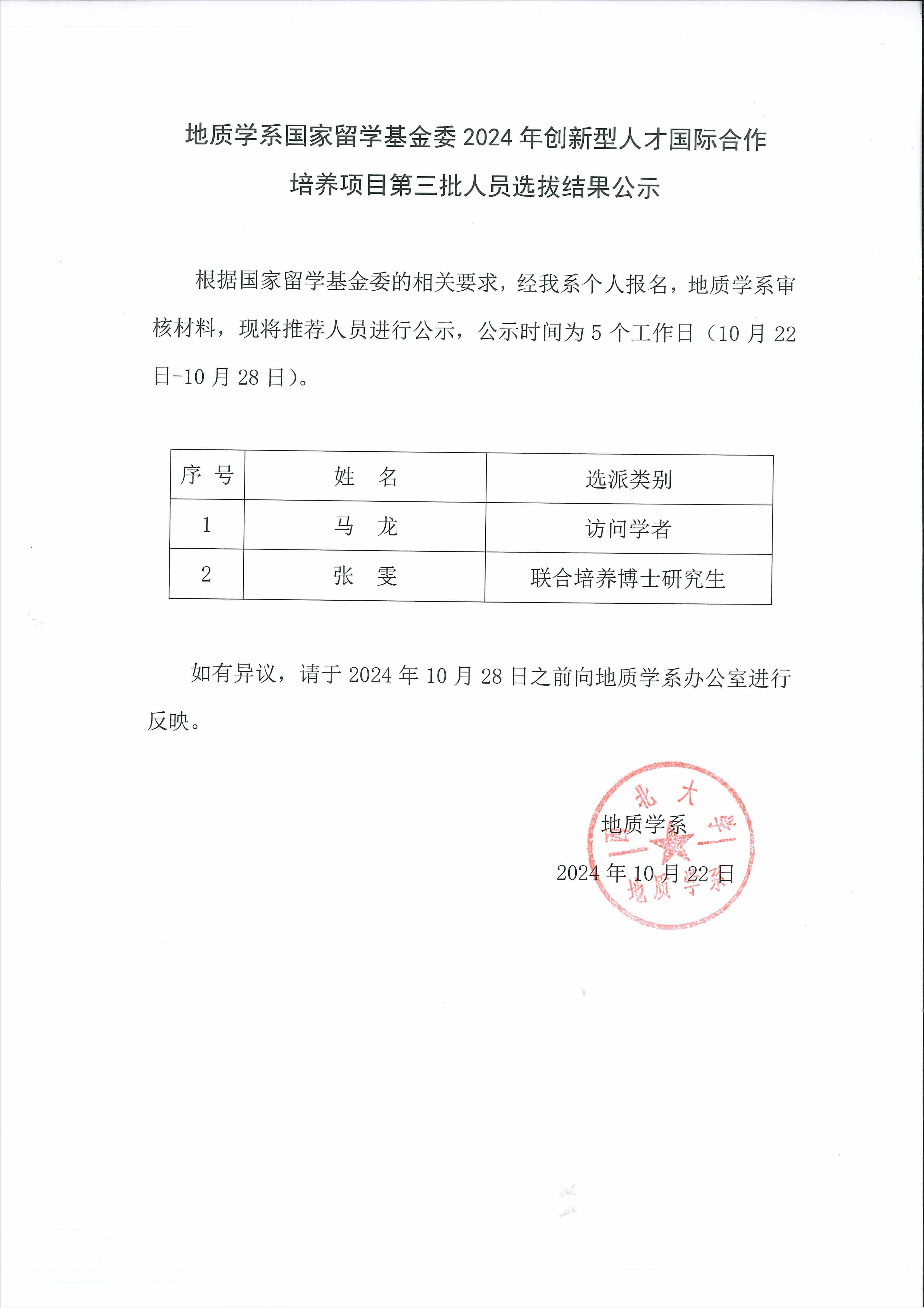 地质学系国家留学基金委2024年创新型人才国际合作培养项目第三批人员选拔结果公示