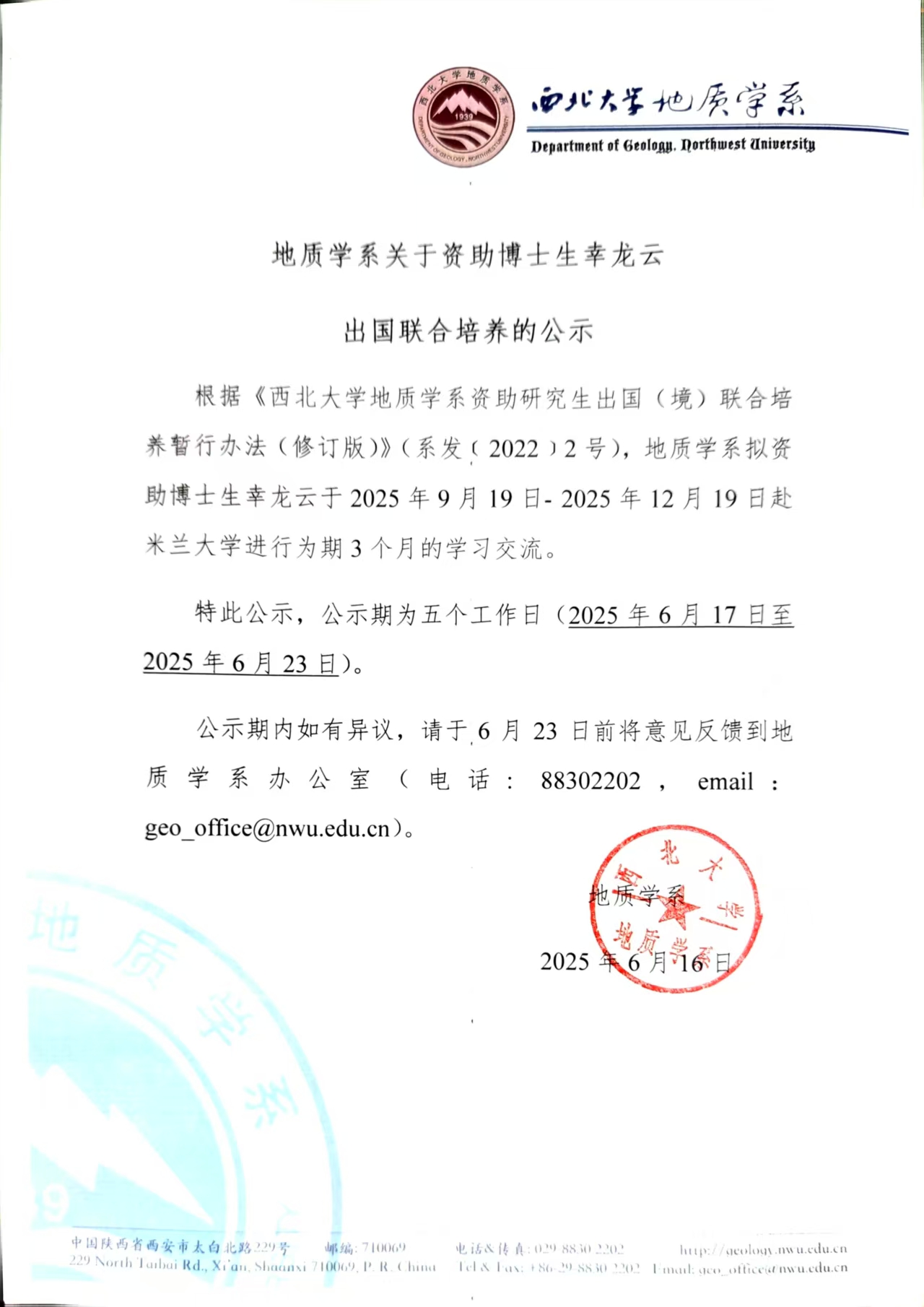 地质学系关于资助博士生幸龙云出国联合培养的公示