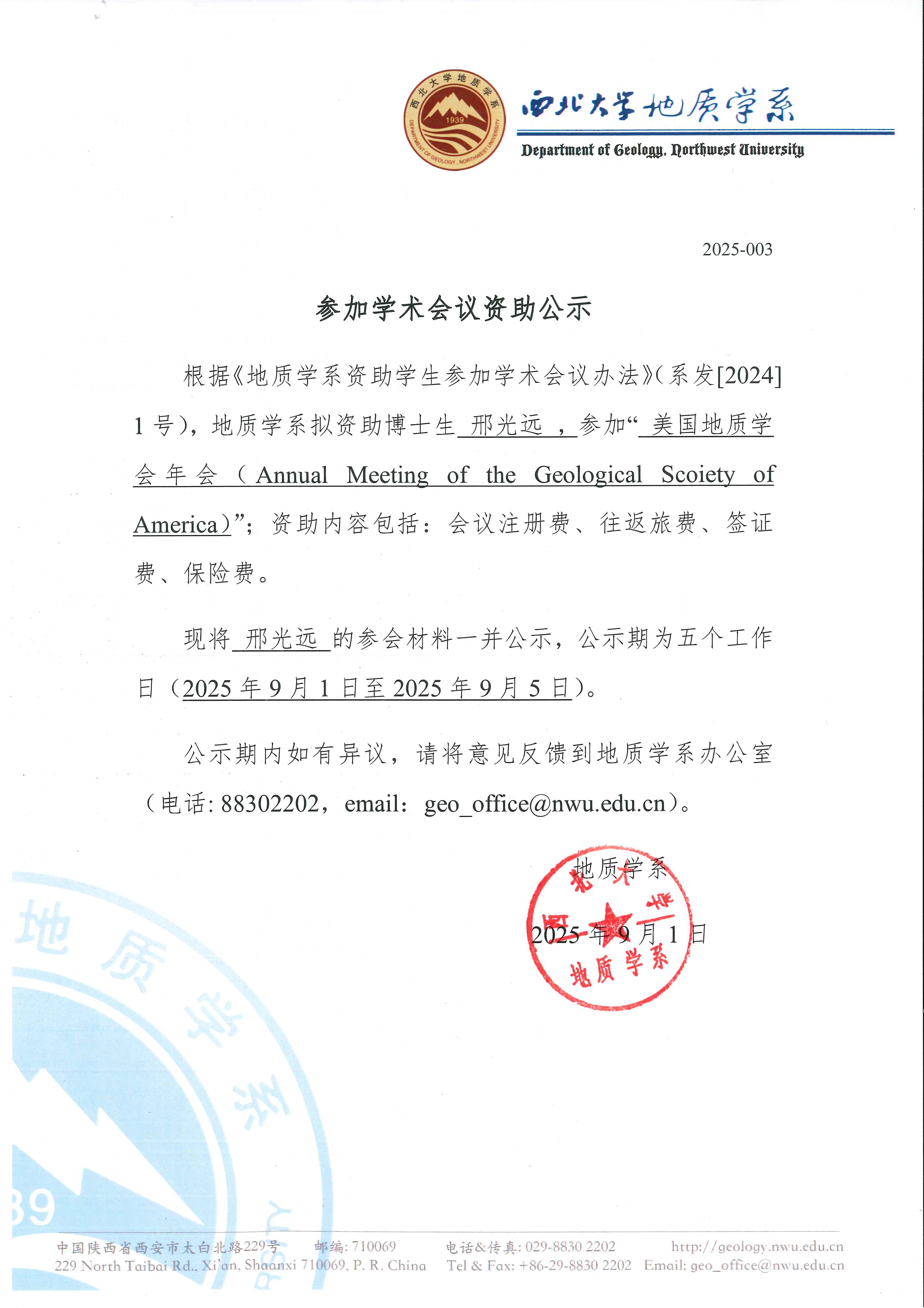 地质学系关于资助博士生邢光远出国事宜的公示