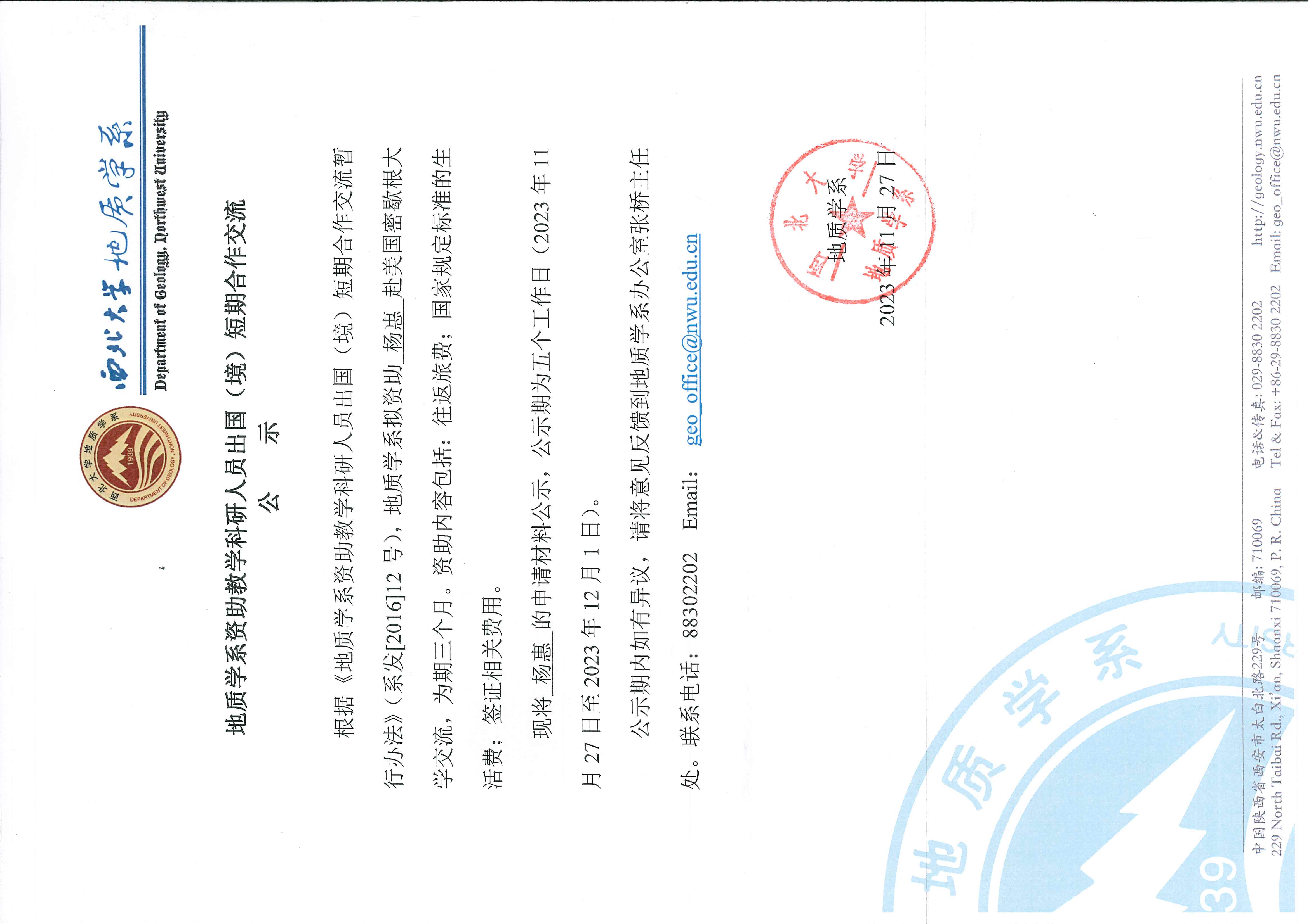 地质学系关于资助博士后杨惠出国短期合作交流的公示