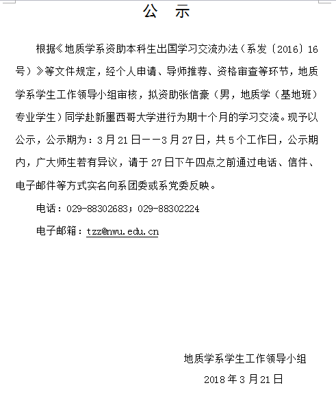 地质学系关于资助张信豪同学出国学习交流的公示