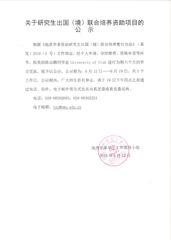 地质学系关于资助陈志鹏同学出国事宜的公示